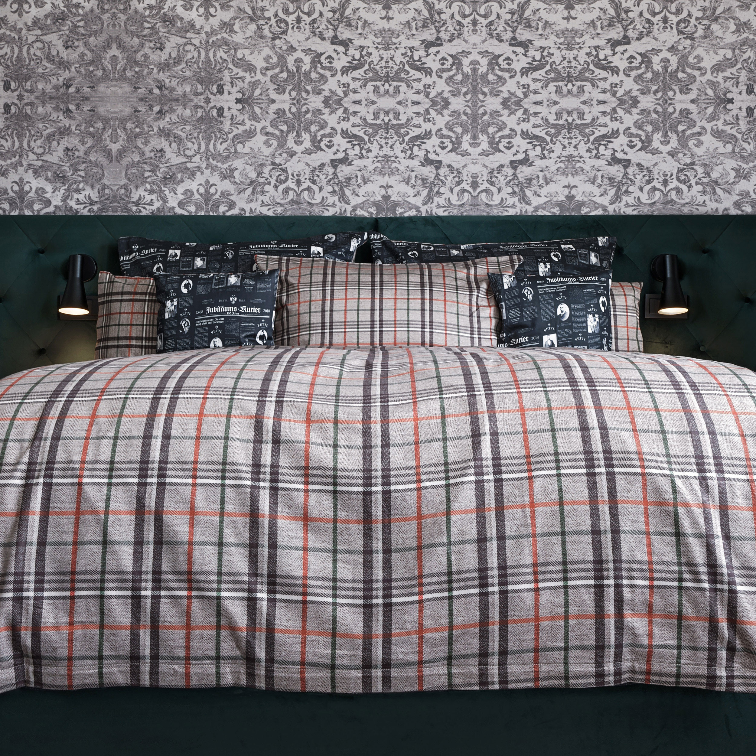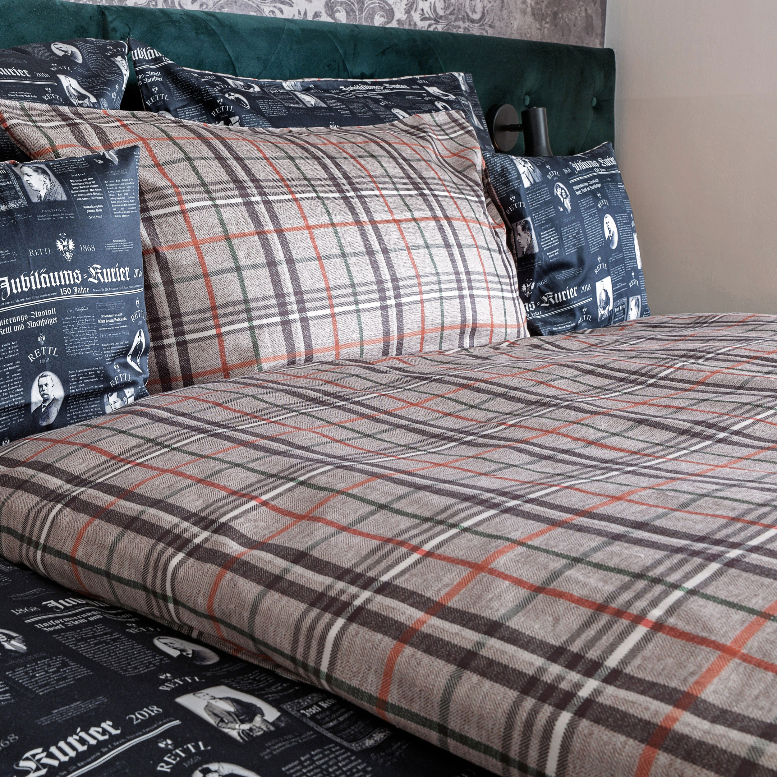 Die Wendebettwäsche aus 100% Satinbaumwolle im Design Jubiläumskurier & Rettl Housecheck.